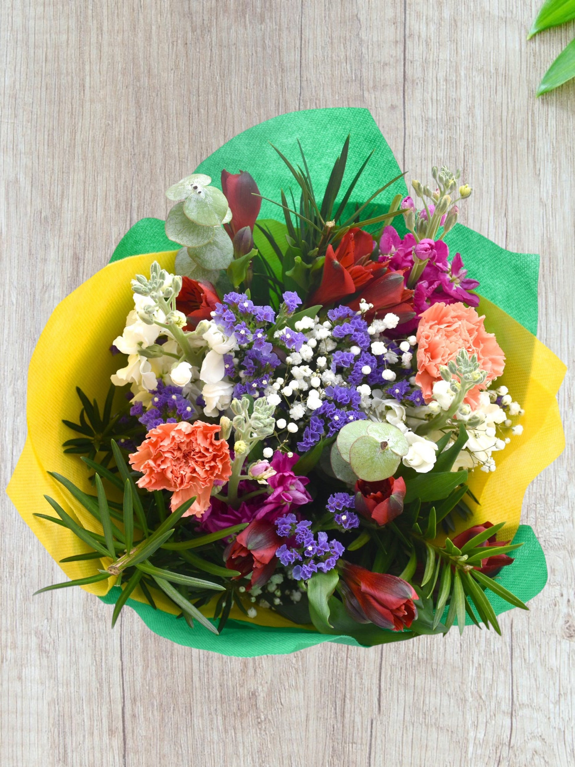 - Each bouquet has 15 stems in total: white stock, hot pink stock, greenery, eucalyptus, red alstroemerias, orange carnations, purple statice, and baby's breath.