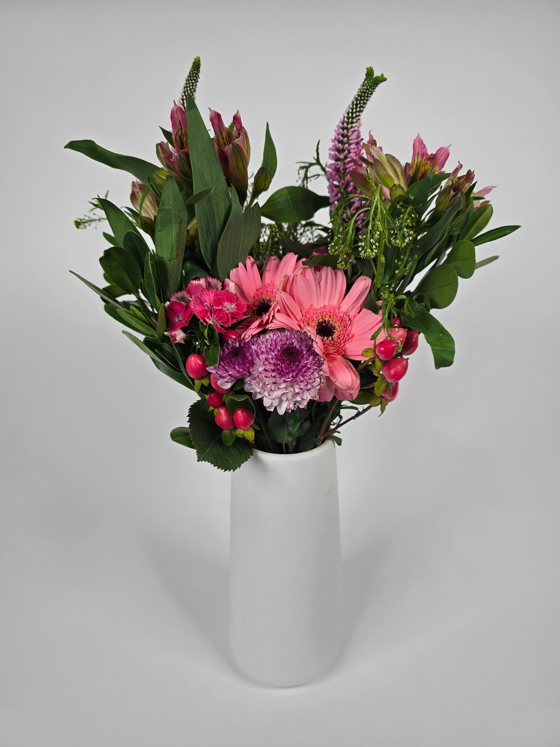 This vibrant mini bouquet in shades of pink and purple is a stunning addition to any occasion, offering a perfect blend of color and elegance. It features bold gerbera daisies, delicate alstroemerias, cheerful poms, and roses as focal flowers, beautifully complemented by the graceful texture of dianthus, veronicas, Queen Anne’s lace, and lush greenery. With 18 stems in total, this bouquet is a lush, full arrangement that exudes charm and sophistication. Each bouquet comes with its own black vase, making it a ready-to-display centerpiece for weddings, special events, or any celebration.
