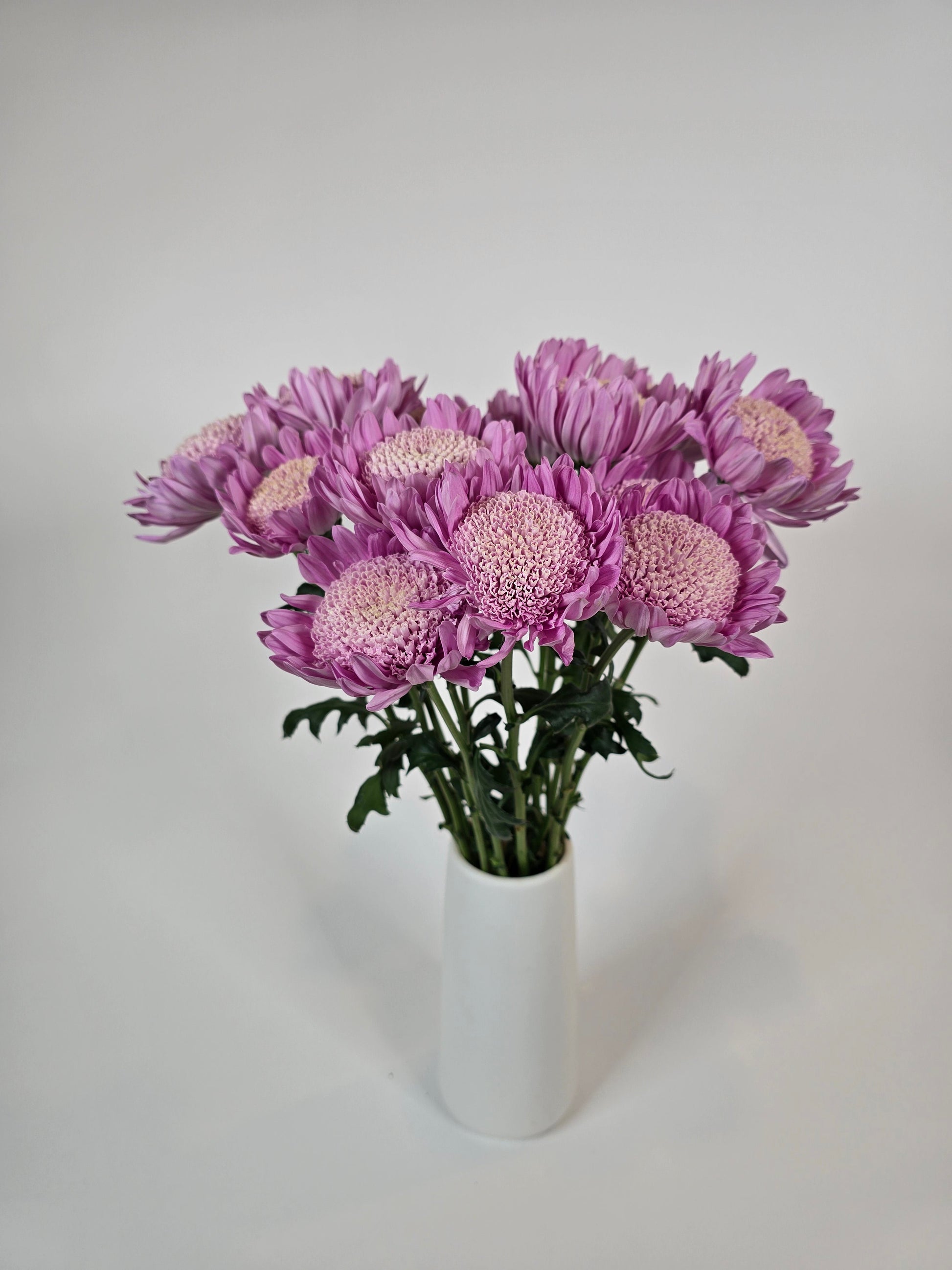 Lilac Cloud Disbud Mum is a beautifully textured decorative chrysanthemum featuring soft lilac to lavender petals and a full, cushion-style center. With its cloud-like form and delicate purple tones, this bloom brings depth, dimension, and a refined softness to floral designs. Perfect for weddings, events, centerpieces, and modern arrangements, Lilac Cloud Disbud Mums are known for their excellent vase life and strong structure, making them a reliable choice for both flower professionals and DIY designers. Their refined, compact bloom size adds layered interest without overwhelming a design, pairing effortlessly with garden roses, ranunculus, pastel palettes, and lush greenery. Farm-fresh and thoughtfully sourced, Lilac Cloud Disbud Mum delivers an elegant, editorial look that feels airy, romantic, and timeless, ideal for creating elevated floral moments that last.