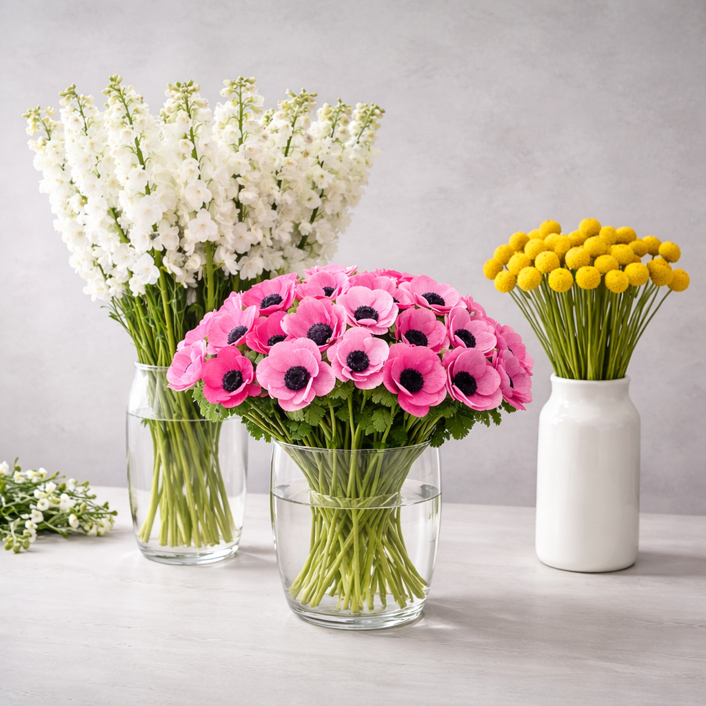 - Blooming Time: Delphinium, Craspedia billy balls, and Anemones need 2-3 days to fully hydrate and bloom after following our care instructions under the "Flower Care" tab, ensuring they're in peak condition for your event.