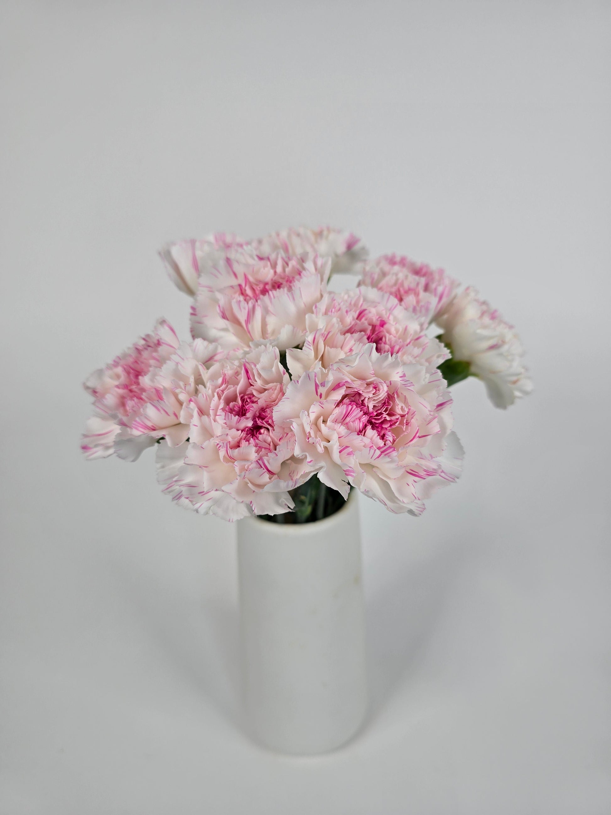 Our unique White carnations with hot pink stripes are striking and unique flowers that combine classic elegance with bold, artistic flair. These carnations feature soft white petals streaked with vibrant hot pink, creating a dramatic contrast that draws the eye and adds personality to any floral arrangement. Symbolically, white carnations often represent purity and remembrance, while the hot pink accents introduce themes of admiration, gratitude, and playful energy. Together, the blend of colors creates a flower that’s both meaningful and eye-catching, perfect for celebrations, special occasions, or as a standout addition to mixed bouquets.