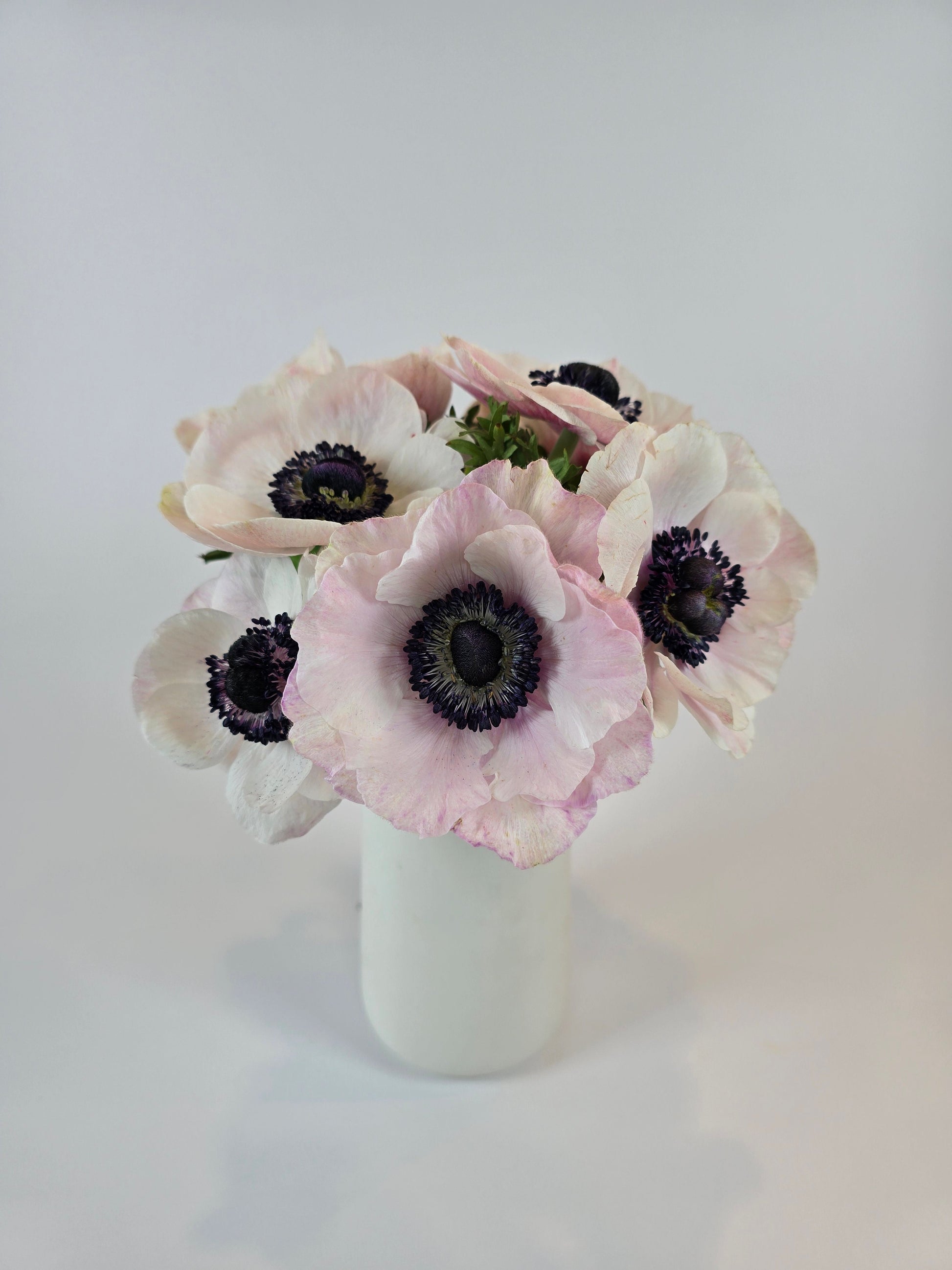 Our White Blush Anemones are a stunning blend of elegance and subtle charm. Featuring crisp white petals with a soft blush-pink center, these blooms offer a delicate yet striking appearance. The dark, contrasting black or deep purple centers add depth and intrigue, making each flower look almost like a work of art. With their graceful petals and eye-catching center, these anemones bring both softness and contrast to any bouquet or centerpiece, making them a favorite for those seeking an elegant yet unique floral design.