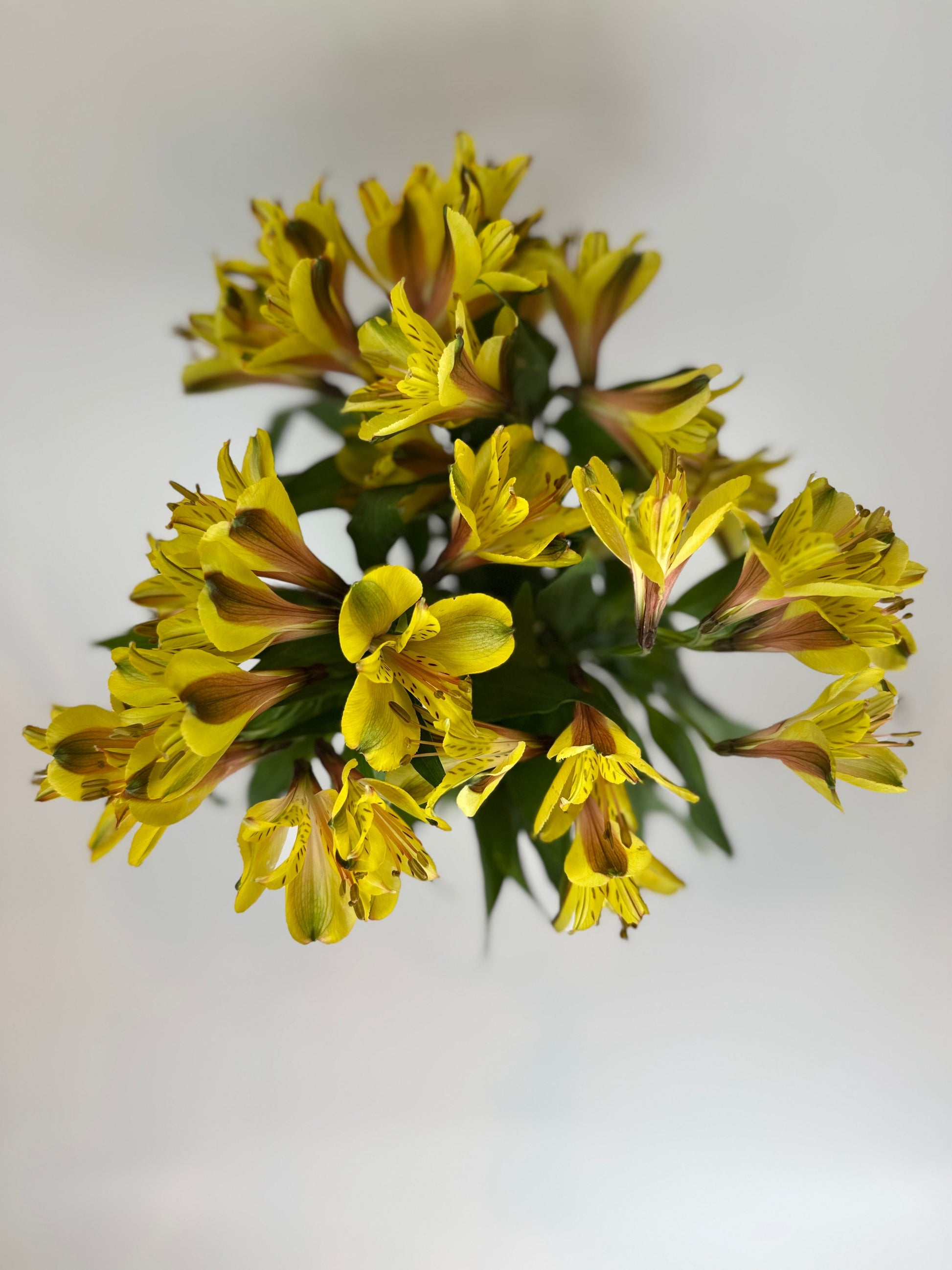 Yellow alstroemerias, also known as Peruvian lilies, are bright and cheerful flowers that bring a vibrant splash of color to any floral arrangement. The blooms are characterized by their rich, golden yellow petals, which are often streaked with subtle hints of orange or red, adding depth and warmth to their appearance. Each flower features six petal-like tepals that form a star-shaped bloom, with dark spots or markings near the center, giving them a striking, almost exotic look. Alstroemerias are known for their long-lasting beauty, making them a popular choice for bouquets, centerpieces, and floral designs that need to endure. The flowers are often clustered together in bunches, creating a full, lush appearance that can stand out in both formal and casual arrangements. The stems are strong and sturdy, making them ideal for both fresh and dried flower displays.